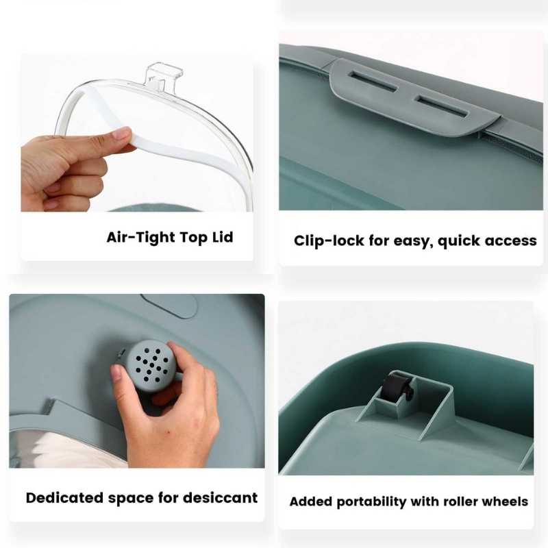 An air-tight top clamshell lid, a large cover secured with clip-locks for easy refills, bottom roller-wheels and a dedicated space for desiccant - this will be the only pet food storage that you'll ever need.